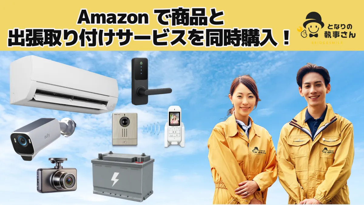 プライムデーやその前の先行セール期間(7月8日〜10日)には、各種商品を購入することで「となりの執事さん」の出張取り付けサービスを利用できます。エアコンやドライブレコーダー、車載バッテリー、屋外防犯カメラ、スマートロック、インターホンといった商品が対象です。いずれも、手順に従って簡単にカートに追加できるため、特別な知識がなくても安心して利用できます。
