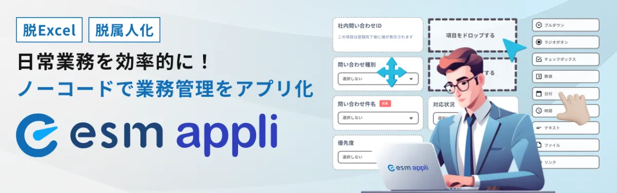 「esm appli」は、プログラミングの知識が不要で、ドラッグ&ドロップの操作だけで業務アプリを作成できる便利なツールです。これにより、企業は迅速に業務効率化とデジタルトランスフォーメーション(DX)の推進が可能になります。今回新たに提供される業務テンプレートを活用することで、社内問い合わせ管理や資産管理など、具体的な業務改善に役立ちます。