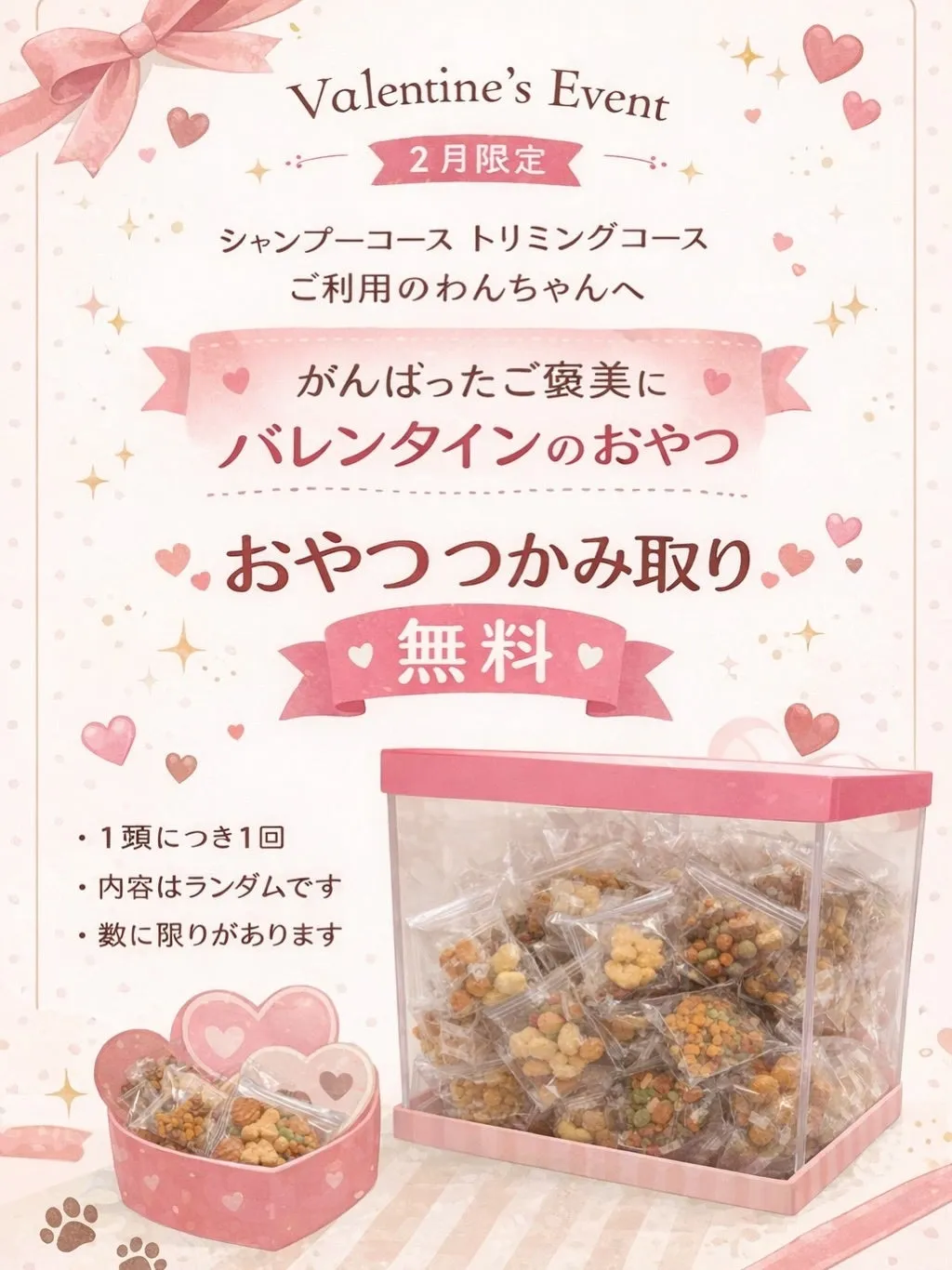 2月のバレンタインキャンペーンを記念して、Pets Tokyo西大井店が特別な「ご褒美おやつ掴み取りキャンペーン」を実施することが発表されました。このキャンペーンは、2月1日から28日までの期間限定で、シャンプーやトリミングのコースを利用した飼い主様に向けた特別なイベントです。