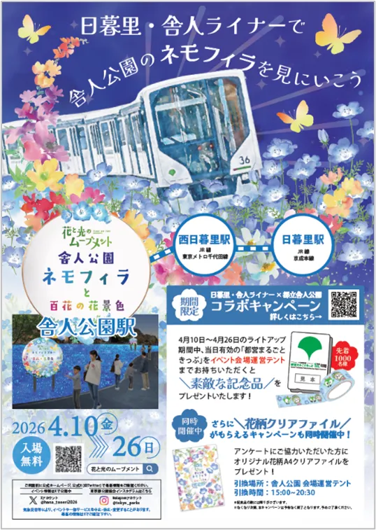日暮里・舎人ライナーと東京都公園協会が共催する「花と光のムーブメント」が、2026年春に再び舎人公園を彩ります。今回は、春の花々に加え、舎人公園の象徴と言えるネモフィラに焦点を当て、「青」の美しさを堪能できる機会です。