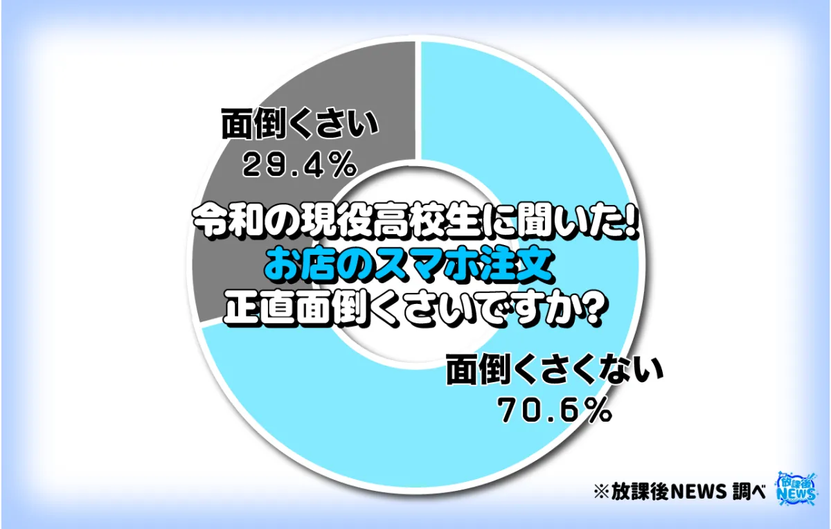 一方で、約70.6%の高校生は「スマホからの注文は面倒ではない」と答えています。彼らは、店員とコミュニケーションを取らなくて済むことを高く評価しています。「店員を呼ばずに自分のタイミングで注文できる」という点が、かえって気楽だという意見が多数寄せられました。中には、声が小さくて店員に頼みづらいと感じる生徒もおり、そういった悩みを解消できるというメリットがあるようです。