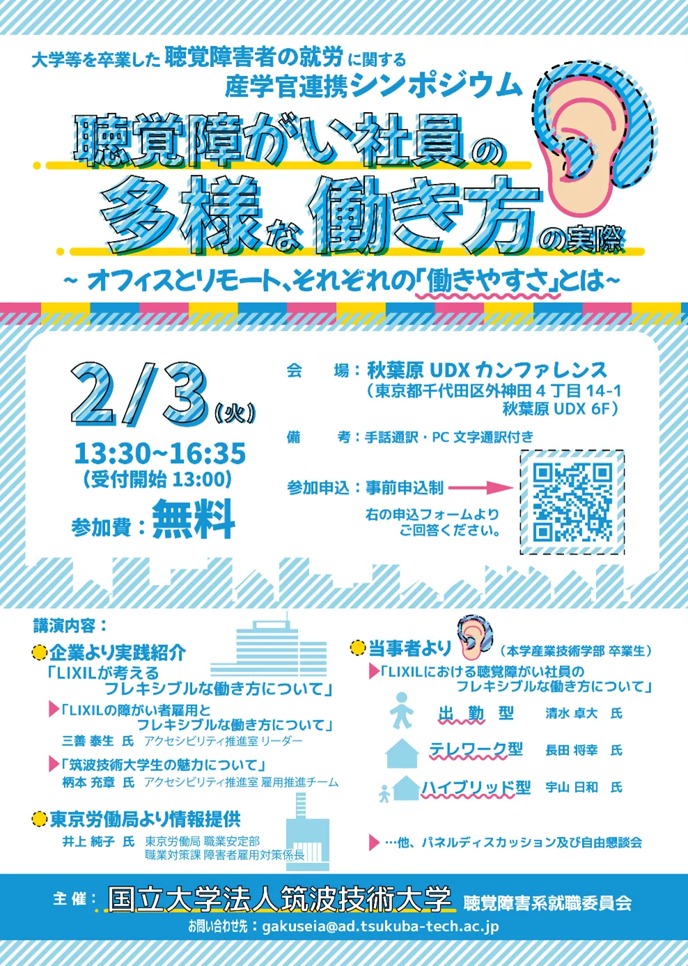 - - 当事者の声:本学の産業技術学部卒業生による、「LIXILにおける聴覚障がい社員の多様な働き方」の紹介も予定されています。勤務形態は出勤型やテレワーク型、ハイブリッド型など多岐にわたります。