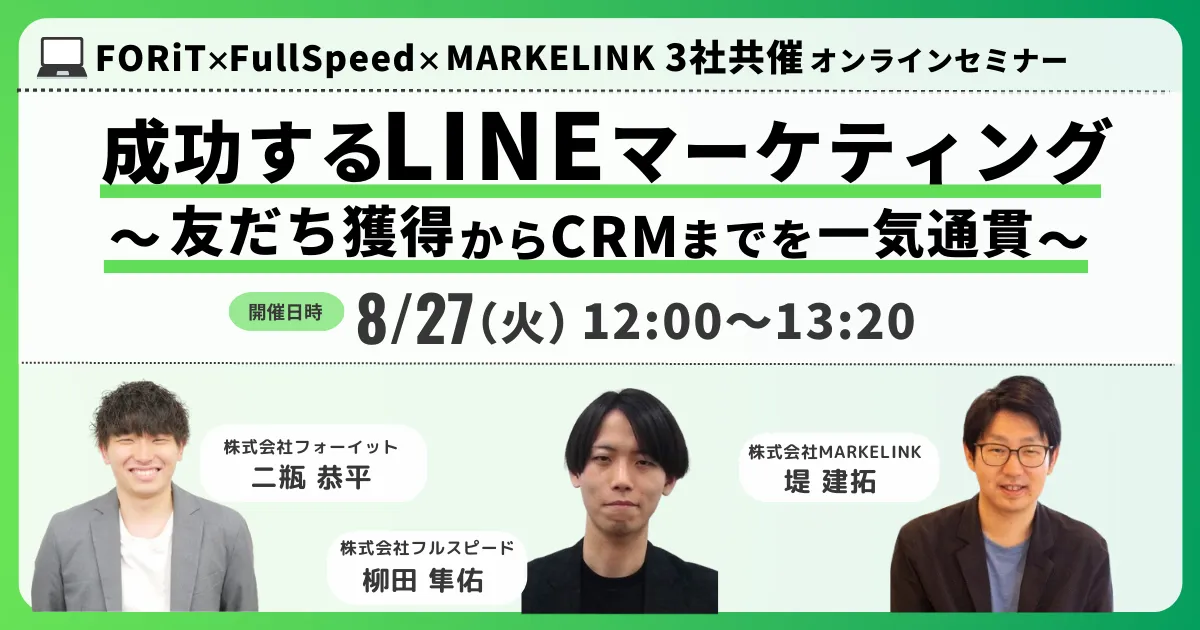 このオンラインセミナーには、株式会社フォーイット、株式会社フルスピード、株式会社MARKELINKの専門家が登壇し、LINE公式アカウントを利用した友だち獲得やCRMの重要性について詳しく解説します。セミナーは以下の予定で進行します。
