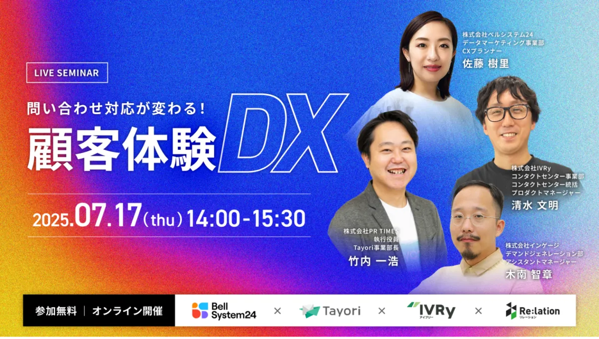 株式会社ベルシステム24は、株式会社インゲージ、株式会社PR TIMES、そして株式会社IVRyと協力し、「問い合わせ対応が変わる!顧客体験DX」と題したオンラインセミナーを開催します。このセミナーは、2025年7月17日(木)14:00から15:30まで、Zoomを通じて行われ、参加費は無料です。