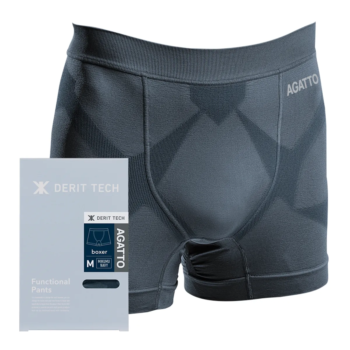 新商品「DERIT TECH×AGATTO 機能性パンツ」は、堀川プロ自らがセレクトした「MIKUMU NAVY」というシックなカラーで展開されます。さらに「AGATTO」のロゴがあしらわれており、見た目のデザインにもこだわりが感じられます。サイズ展開はMサイズからLLサイズまで用意されているため、さまざまな体型の人にフィットします。
