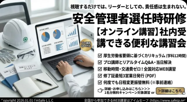 2026年4月3日、アイムセーフが提供する【安全管理者選任時研修】がオンライン形式で開催されます。この講座は、労働安全衛生法第11条に基づいた安全管理者の資格を取得するための重要な研修です。講習内容は、労働安全衛生規則第5条に準拠しており、全国どこからでも参加可能という利便性を兼ね備えています。