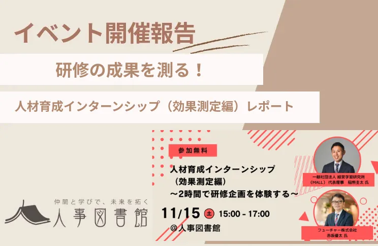 2025年11月15日、東京都中央区に位置する「人事図書館」において、『人材育成インターンシップ(効果測定編)』『人材育成インターンシップ(効果測定編)〜2時間で研修企画を体験する〜』が開催されました。主催は株式会社Trustyyleで、フューチャー株式会社の赤坂優太氏と一般社団法人経営学習研究所の稲熊圭太氏を講師に迎え、参加者に具体的な研修の効果測定方法を教えるプログラムが展開されました。