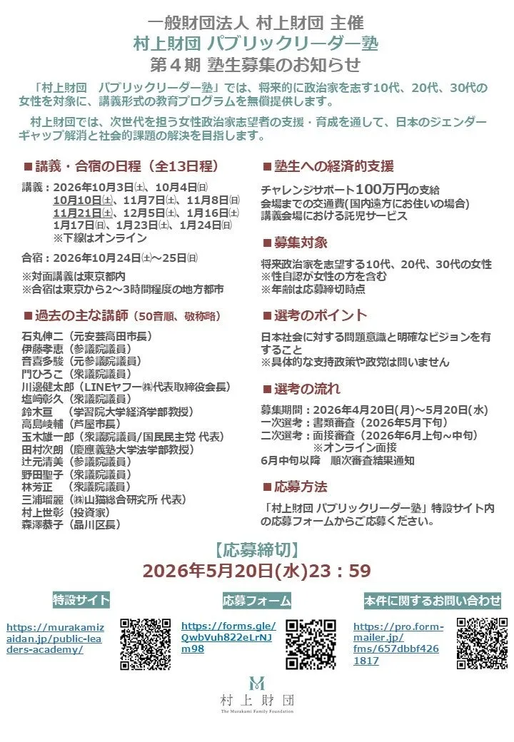 特に、女性の政治参画を推進するためには、長期的な支援と環境整備が重要です。そこで村上財団は「パブリックリーダー塾 第4期」を新たに開講し、次世代を牽引する女性政治家を支えるためのプログラムを実施します。この塾は、女性が立候補しやすい環境を整え、日本のジェンダーギャップを解消し、社会課題の解決に努めることを目指しています。