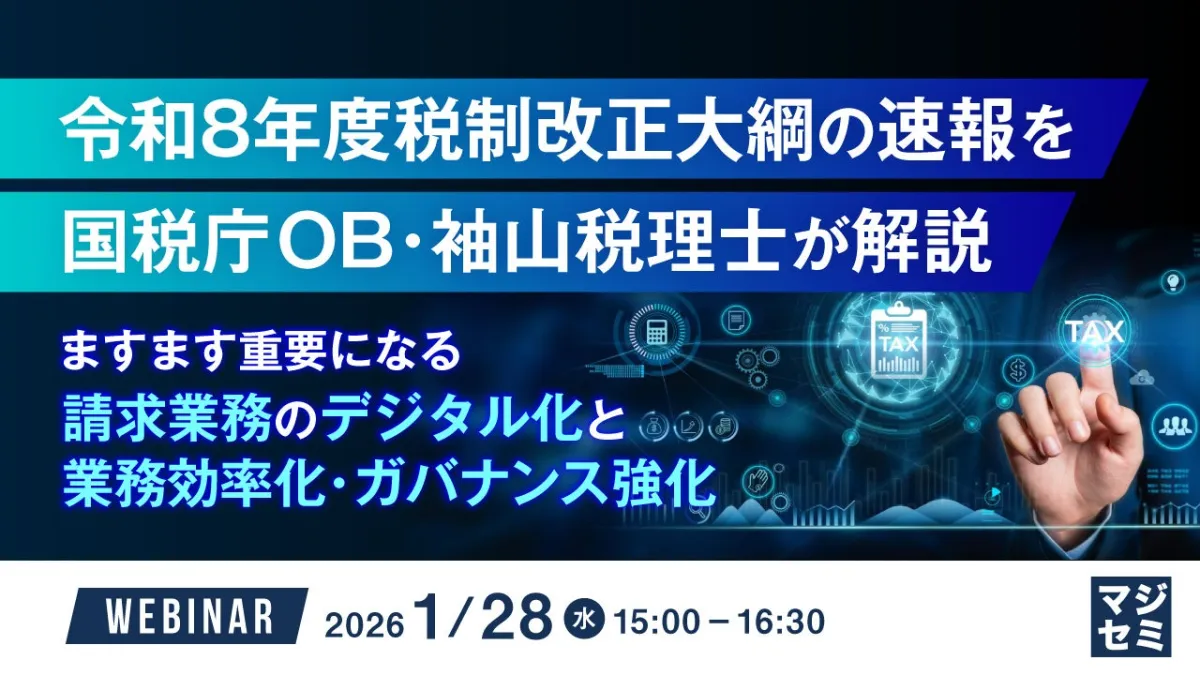本セミナーでは、国税庁OBである袖山税理士が、令和8年度税制改正大綱の速報について、分かりやすく解説します。この内容は、特に経理業務に従事している方にとって大変有用です。具体的には、税制改正に対応するための請求業務全体のデジタル化・効率化の重要性や実際の運用事例が紹介されます。