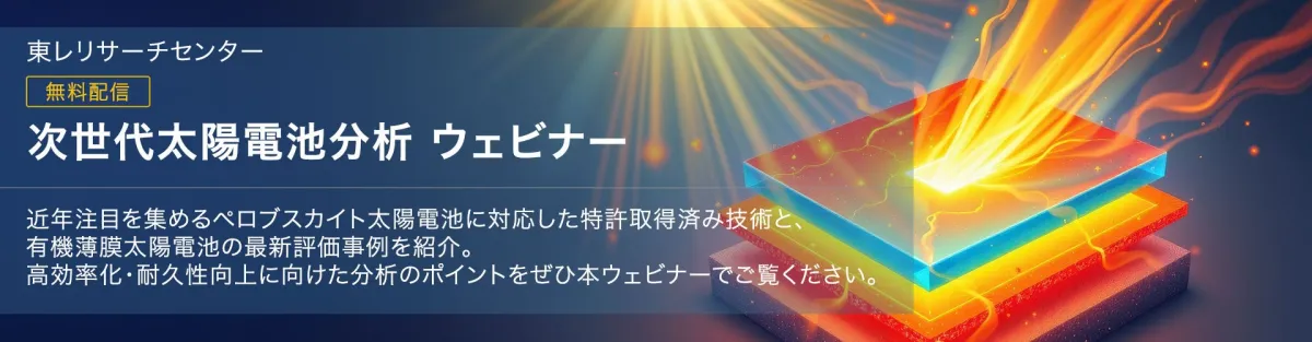 次世代太陽電池の研究や評価に携わる方々にとって、分析視点から設計や評価を見直すための貴重なヒントが提供される内容となっています。東レリサーチセンターでは、今後も研究開発や品質評価に役立つ最新の技術情報を継続的に発信していく予定です。