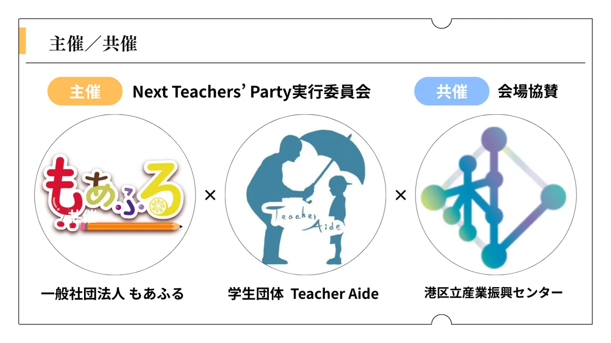 - - 主催: Next Teachers' Party実行委員会(一般社団法人もあふる、学生団体TeacherAide)