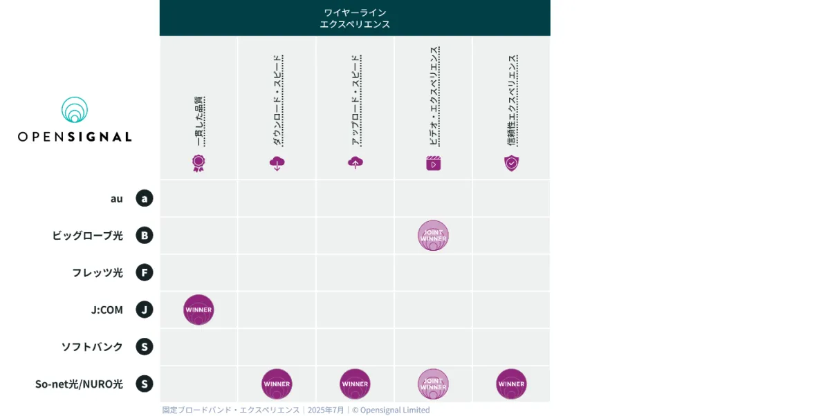 地域のインターネットサービスプロバイダー(ISP)も良好な成果を上げており、名古屋ではコミュファ光が「一貫した品質」で単独勝者となり、大阪ではeo光ネットが「信頼性エクスペリエンス」で同じく単独勝者となりました。