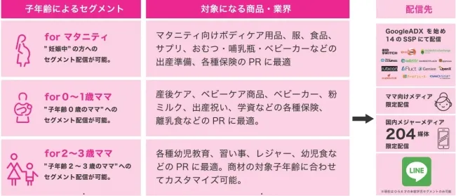 マインドシェア・ママ・マーケティング・カンパニー(M3C)は、アクティブなママたちを直接ターゲットにした新しい広告配信サービス「MaMaReachDSP」を開始しました。このサービスは、子供の年齢によってセグメントし、特定のママ層に効率よくリーチできるのが大きな特徴です。