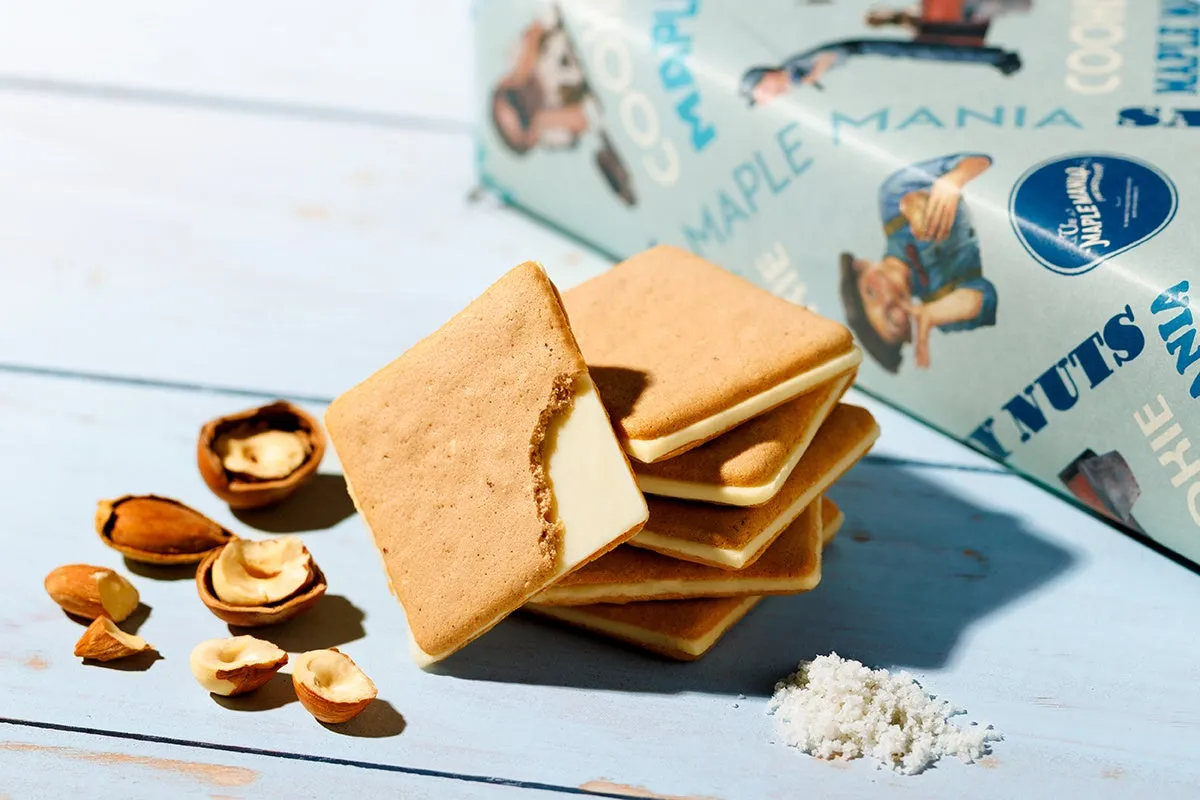 今年も期待を裏切らない人気商品が帰ってきました。このクッキーはメープルシュガー、ヘーゼルナッツ、アーモンドプラリネが贅沢に練り込まれ、バニラ風味のチョコでサンドされています。上品なメープルの香りが漂う中、ナッツの風味と塩味が調和し、まさに大人のためのクッキーと言えるでしょう。