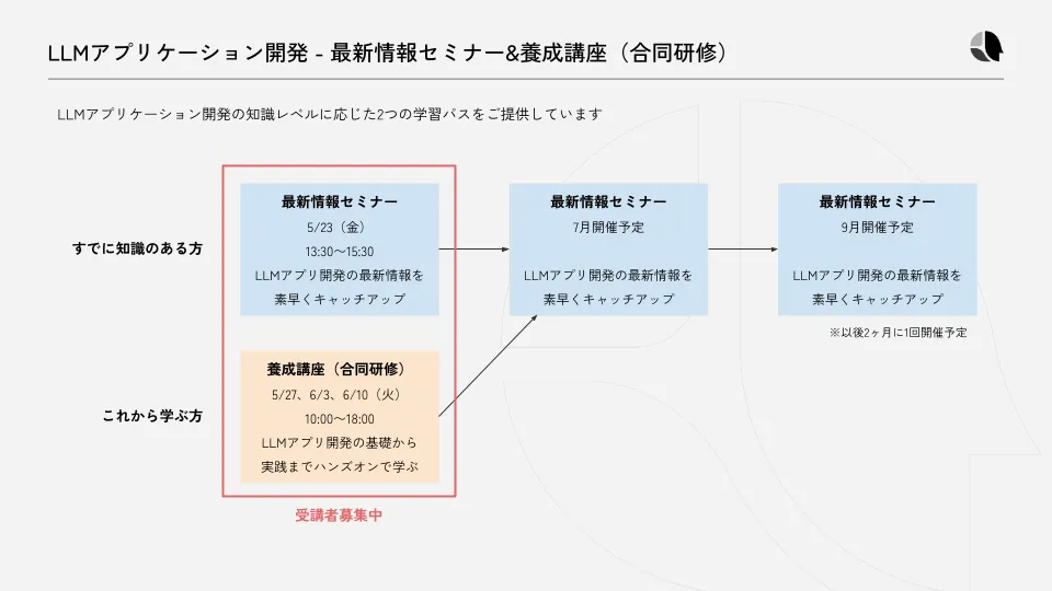 株式会社ジェネラティブエージェンツは、2025年5月に「LLMアプリケーション開発 - 最新情報セミナー」と「LLMアプリケーション開発者養成講座」を開催します。これらは、AIエージェントと協働する世界をつくることを目的としたもので、企業や個人のニーズに応じた研修プログラムです。