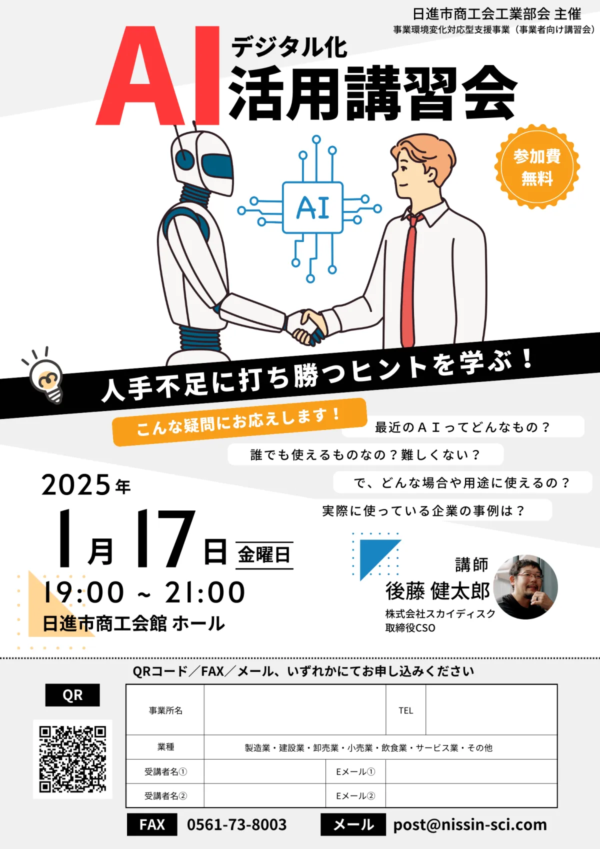 2025年1月17日金曜日、愛知県日進市において、株式会社スカイディスクが主催する「デジタル化AI活用講習会」が開催されます。この講習会は、地域の製造業を対象に、デジタル技術を活用した業績改善の実践例を学ぶ絶好の機会となっています。