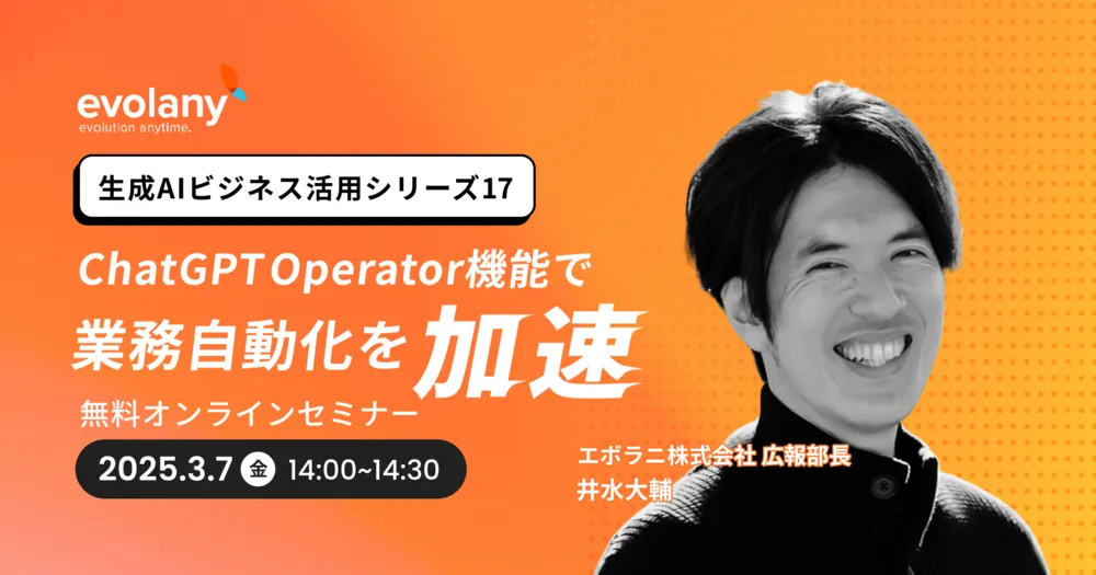 2025年3月7日(金)に開催されるオンラインセミナーでは、ChatGPTの最新機能『Operator』の具体的な活用方法を解説します。『Operator』は、仕事のプロセスを自動化し、さらなる効率化を実現することが期待される機能です。この新しい機能がどのようにビジネスに貢献できるのか、具体例を交えて解説します。