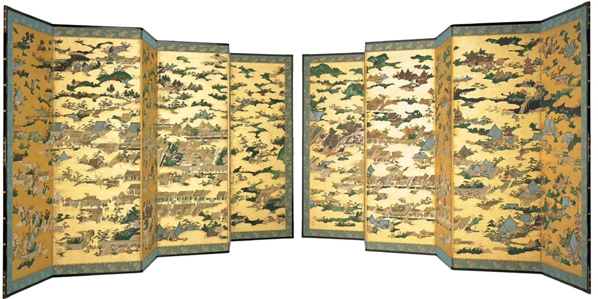 上杉本洛中洛外図屏風は、戦国時代の著名な武将・織田信長が、越後の名将・上杉謙信に贈ったとされ、狩野永徳による最高傑作の一つです。この屏風は、江戸時代以前の桃山時代に制作され、京都の風景とそこでの人々の生活を美しく描写しています。制作からおよそ440年が経つ今、その保存状態が懸念されています。