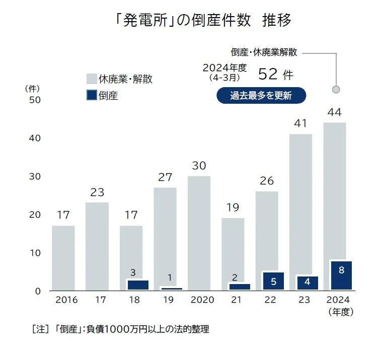 再生可能エネルギーを中心とした発電事業者が、近年深刻な経営危機に直面しています。2024年度における発電所の倒産件数は、過去最多の52件に達しました。この現象は、太陽光発電や木質バイオマス発電を主にした事業者に特に顕著であり、彼らは維持管理コストの上昇や燃料費の高騰に加え、FIT制度の買取価格引き下げの影響を大きく受けています。