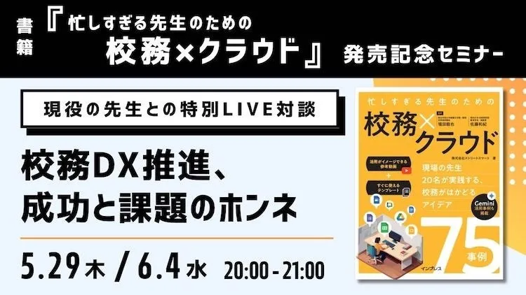 2023年6月3日(火)に発売される書籍『忙しすぎる先生のための 校務×クラウド』のリリースを記念して、今回のオンラインセミナーが行われることが決定しました。この書籍は、今まさに教育現場で奮闘している20名の先生方が実際に行った校務におけるICT活用の事例を集めており、具体的な成功&失敗の体験を詰め込んでいます。