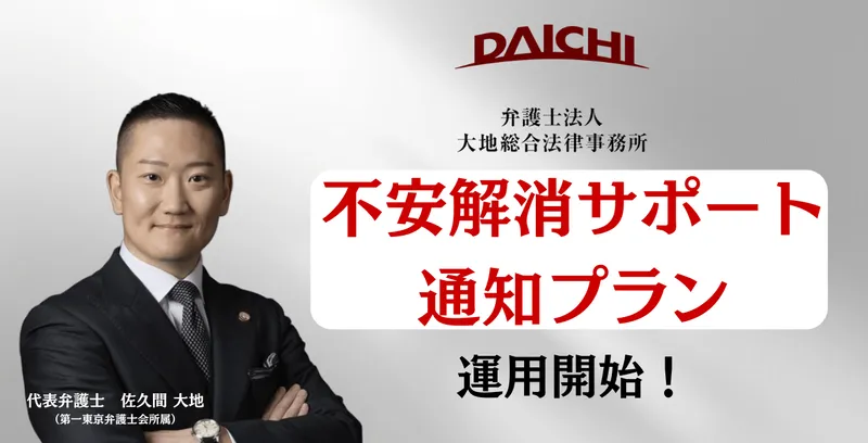 多くの被害者は、「訴訟されたらどうしよう」といった恐怖から冷静な判断ができず、行動に迷いが生じています。このような状況に対応するため、大地総合法律事務所は「不安解消サポート通知プラン」を導入しました。