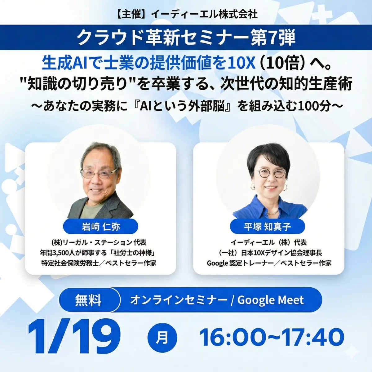 2026年1月19日、イーディーエル株式会社が主催の「クラウド革新セミナー第7弾」が開催されます。このセミナーのテーマは、"生成AIで士業の提供価値を10Xへ"。士業やコンサルタントとして活躍するには、知識を単なる情報共有から独自の価値へと昇華させる必要があるのです。今回のセミナーでは、士業が抱える「知識のコモディティ化」に立ち向かう方法を探ります。