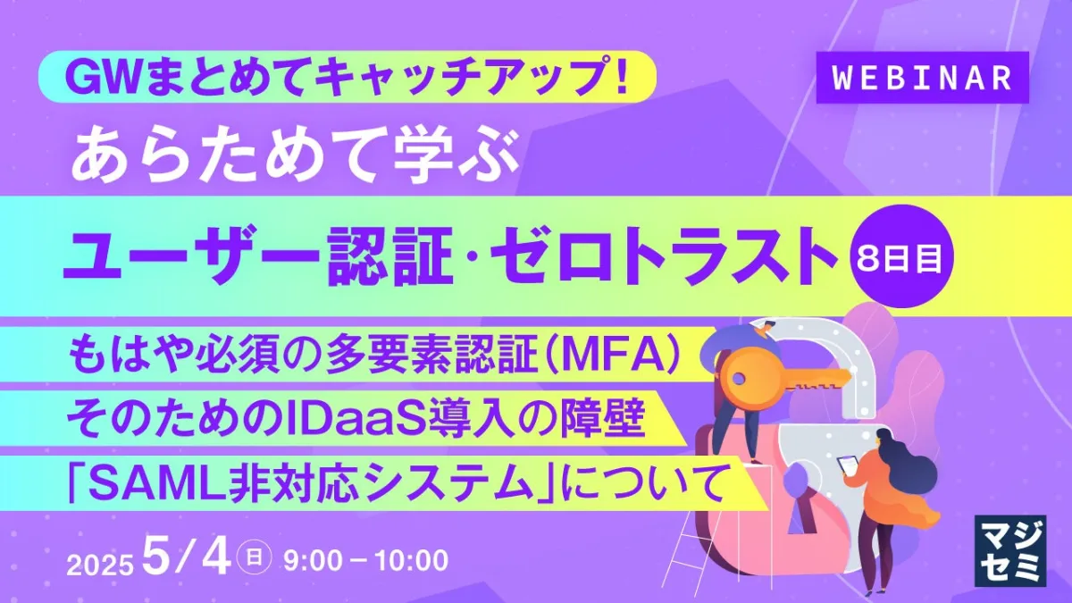 近年、企業のシステムにおけるセキュリティ対策として、多要素認証(MFA)が重要視されています。この流れを受けて、2024年6月24日(月)に開催されるウェビナー『GWまとめてキャッチアップ! あらためて学ぶユーザー認証・ゼロトラスト<8日目>』では、企業が直面する様々な課題に焦点を当てます。