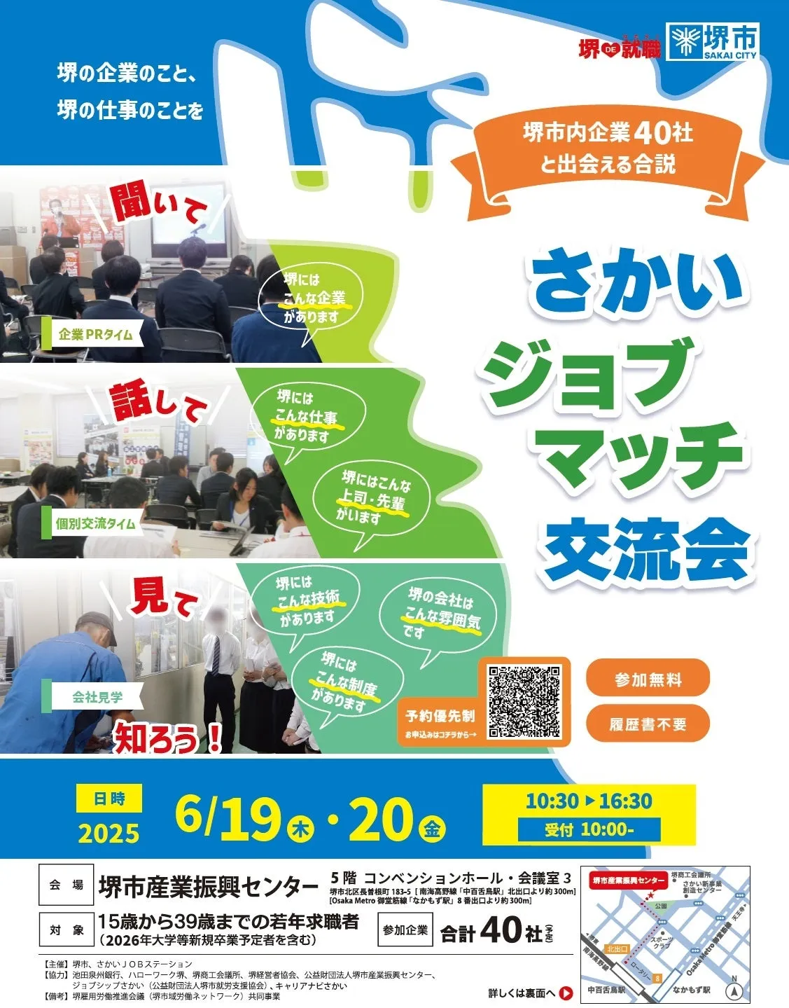 堺市で開催される「さかいジョブマッチ交流会」は、求職者と企業が直接出会い、相互理解を深める貴重なイベントです。この交流会は、堺市の就職支援拠点である「さかいJOBステーション」が主催し、主に若年層を対象としています。イベントは2025年6月19日(木)と20日(金)の2日間にわたり、堺市産業振興センターにて行われます。