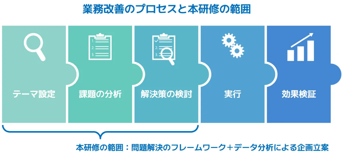 「業務改善のためのデータ活用実践講座」は、問題解決の技術とデータ分析を融合させ、業務改善に必要な実務的スキルを体系的に学ぶことができるプログラムです。この講座では、テーマ設定から課題の分析、解決策の考案までのプロセスを一連の流れで扱い、実践的なデータ活用能力を高めることができます。