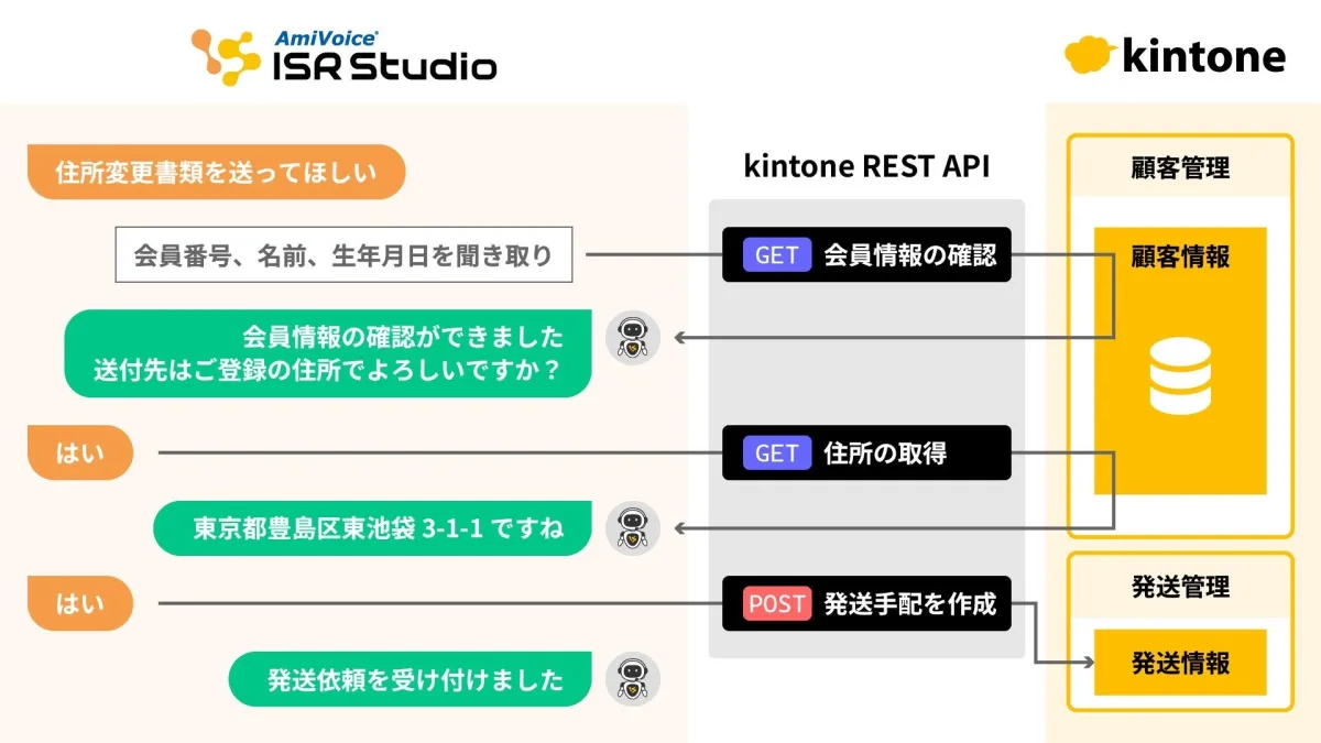 連携機能の強化により、AmiVoice ISR Studioは外部システムが提供するREST APIとスムーズに連携できるようになりました。これにより、特定の環境に依存することなく、多様な業務システムとの柔軟な統合が可能です。具体的には、「kintone」に登録された顧客情報を参照することで、「会員番号による本人確認」や「ヒアリング」などの業務が自動化され、電話応対の精度と効率が大幅に向上します。また、得られた情報に基づいて「予約内容のアップデート」や「履歴の自動登録」なども実施可能です。