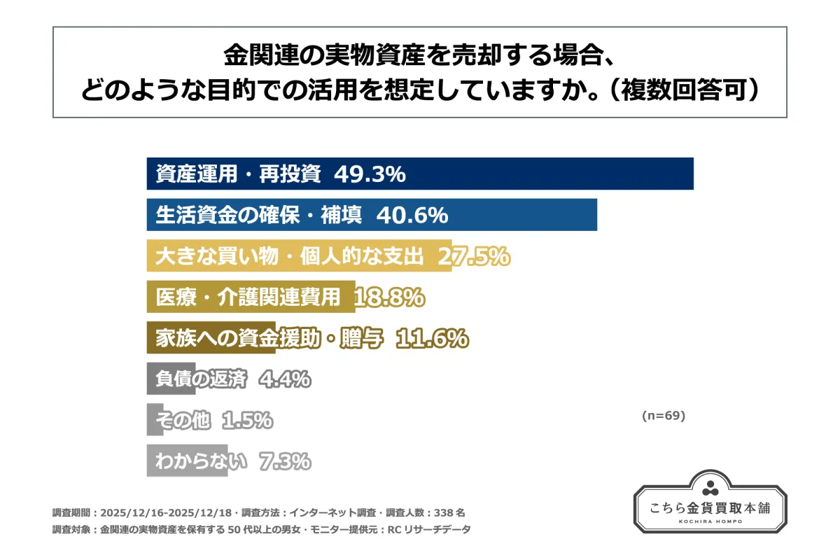 もし売却する場合、最も多く挙げられた理由は「資産運用・再投資」で49.3%を占め、続いて「生活資金の確保・補填」が40.6%、そして「大きな買い物や個人的な支出」が27.5%という結果が出ました。