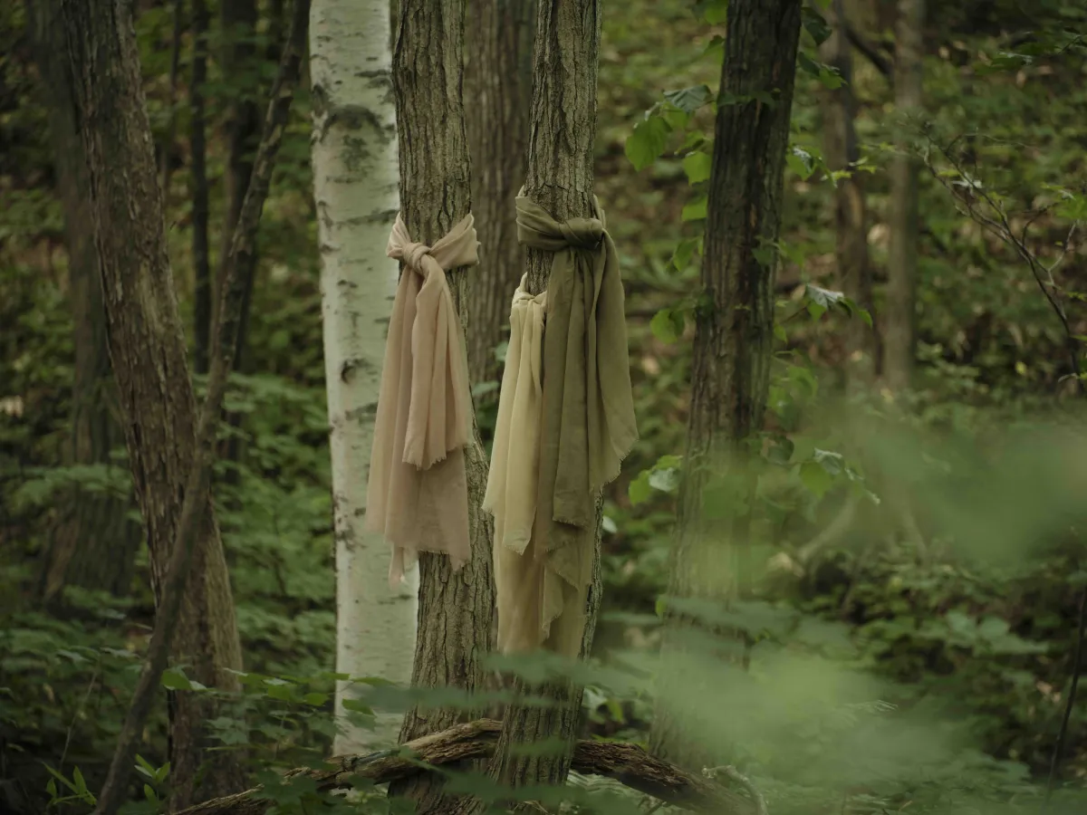 『森染めショール』は、ニセコの森から採取した草木を染料として使用しています。特に、白樺、山桜、よもぎの自然な色合いを生かしながら染め上げられたこのショールは、見る人を魅了する優しい色彩が特徴です。肌触りもとても良く、春から夏にかけての軽やかな装いにもぴったりです。