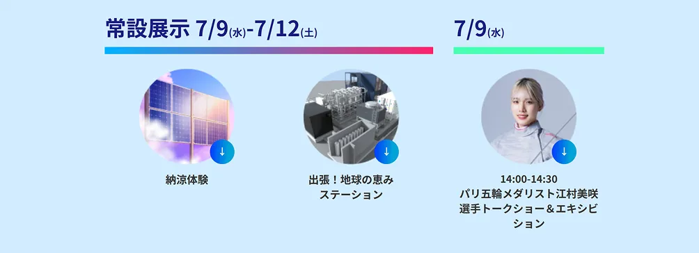 期間中は、「出張!地球の恵みステーション」や「納涼体験」という特別企画も実施されます。「地球の恵みステーション」では、公式スタンプが設置されており、参加者はスタンプラリーを通じて楽しみながら地球環境について学ぶことができます。また、垂直ソーラー発電システム「VERPA(ヴァルパ)」を活用した最新の納涼空間も登場し、暑さを和らげながら快適に過ごすことができる空間が提供されます。