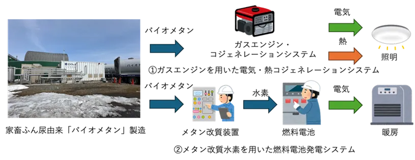 本実証実験では、美幌町実証実験住宅にてエア・ウォーターが製造したバイオメタンガスを利用し、北見工業大学が以下の2つの主なシステムの高度化に取り組みます。まずは、ガスエンジンを利用したコジェネレーションシステムの効率を向上させ、電気と熱の生産を同時に行う技術を強化します。次に、メタン改質水素を用いた燃料電池発電システムの性能を向上させ、メタンから利用可能なエネルギーへの変換効率を高めることを目指しています。このような取組は、日本国内でも唯一の事例として注目されています。