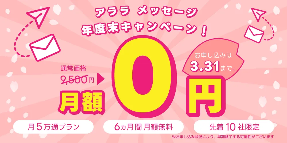 キャンペーンの対象は法人で、先着10社に提供される「アララ メッセージ」の5万通プランが利用可能です。通常価格は月額9,500円、初期費用が50,000円ですが、キャンペーン期間中は月額費用が無料となります。ただし、初期費用は必要ですのでご注意ください。