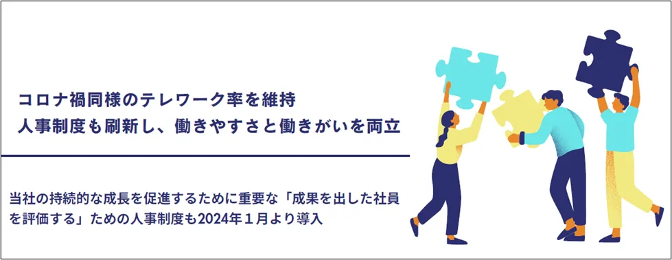 社員が『働きやすさ』と『働きがい』を実感できるよう、働きやすい環境の整備や評価制度の充実が図られています。具体的には、活躍する社員への報酬評価を明確にする仕組みが導入されています。