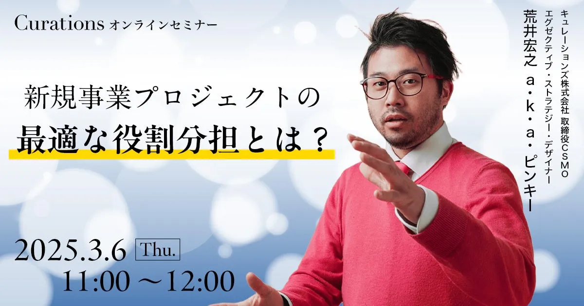 2025年3月6日(木)11時から、キュレーションズ株式会社による無料のオンラインセミナーが開催されます。本セミナーのテーマは「新規事業プロジェクトの最適な役割分担とは?」です。このセミナーでは、新規事業における各メンバーの役割を明確にする方法について詳しく解説されます。