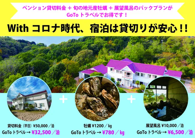 「旬の地元産牡蠣と展望貸切風呂プラン」では、宿泊料金や牡蠣代、展望貸切風呂代が全てGoToトラベルの割引対象となります。