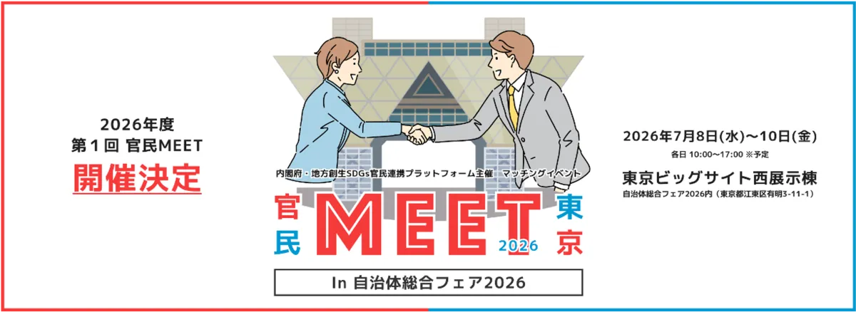 内閣府の地方創生SDGs官民連携プラットフォームは、2026年7月8日から10日まで東京ビッグサイトで「官民MEET東京」という官民マッチングイベントを実施します。このイベントは、自治体と民間企業・団体が直接対話をすることで、地域課題の解決に向けた新たな連携機会を創出することを目的としています。