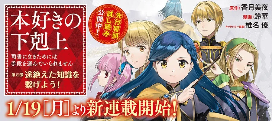 2024年1月19日(月)、漫画配信サイト「コロナEX」で『本好きの下剋上【第五部】』の連載がスタートします。この人気シリーズは、原作の香月美夜氏とイラストの椎名優氏のコラボレーションによるもので、ファンの期待を大いに集めています。