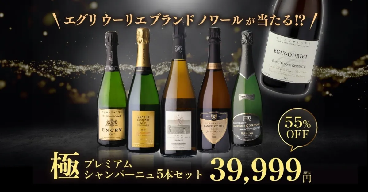 この豪華なシャンパンセットの販売価格は39,999円(税込)で、シャンパン好きにはたまらない内容となっています。特筆すべき点は、シャンパンの最高峰である「グランクリュ」から厳選された5本がセットになっている点です。