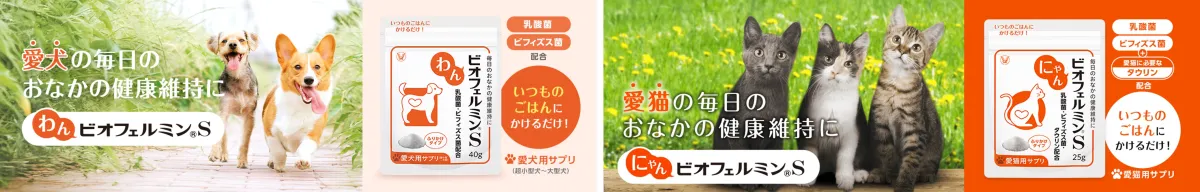 「わんビオフェルミンS」と「にゃんビオフェルミンS」は、愛犬・愛猫の腸内フローラを整えて日常の健康を維持するための製品です。特に、生きたまま腸まで届くビフィズス菌やアシドフィルス菌(乳酸菌)が配合されています。そして、猫のためには必須アミノ酸であるタウリンも加えられています。