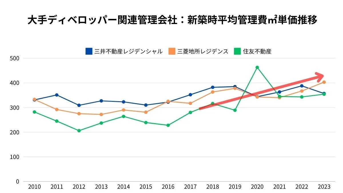 全国の大手ディベロッパー関連管理会社における管理費は、2016年以降、全体的に上昇傾向にあります。そのため、消費者が新築マンションを購入する際、管理費がどれほどかかるかは重要な判断基準となるでしょう。特に東京都内では、新築マンションの供給数が減少しているため、競争は激化し、より高単価での管理業務が求められています。