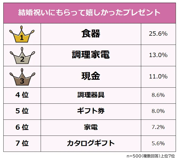 調査結果によると、結婚祝いにもらって嬉しかったプレゼントのトップは「食器」で、その支持率は25.6%でした。以下、人気のアイテムをランキング形式で紹介します。