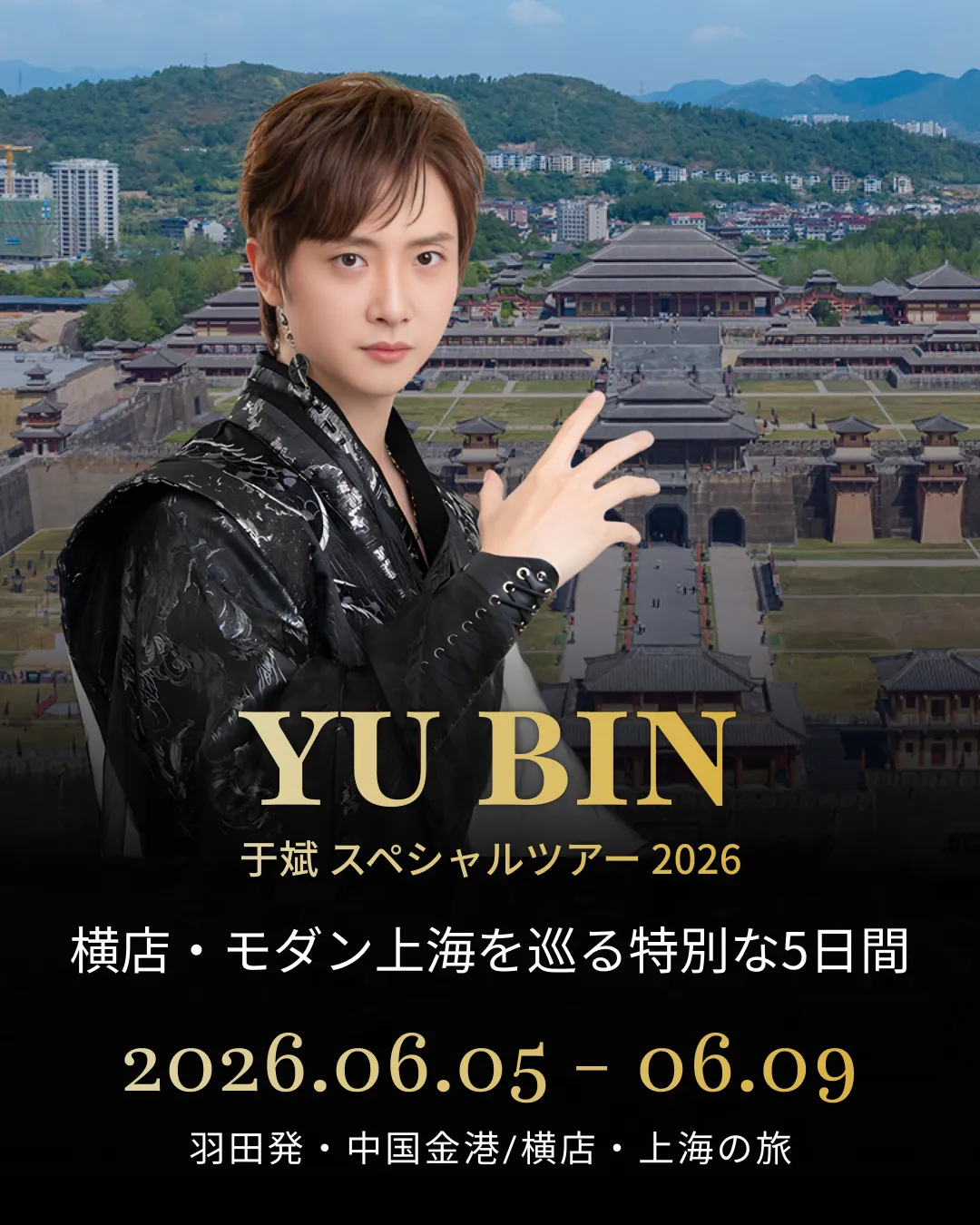 中国の人気俳優・于斌(ユー・ビン)が率いるユニークな旅、「YU BIN / 于斌 スペシャルツアー 2026 ~横店・モダン上海を巡る特別な5日間~」の開催が決定しました。本ツアーは、于斌の手がける特別なツアーとして、ファンに向けた魅力的な体験が盛りだくさんです。