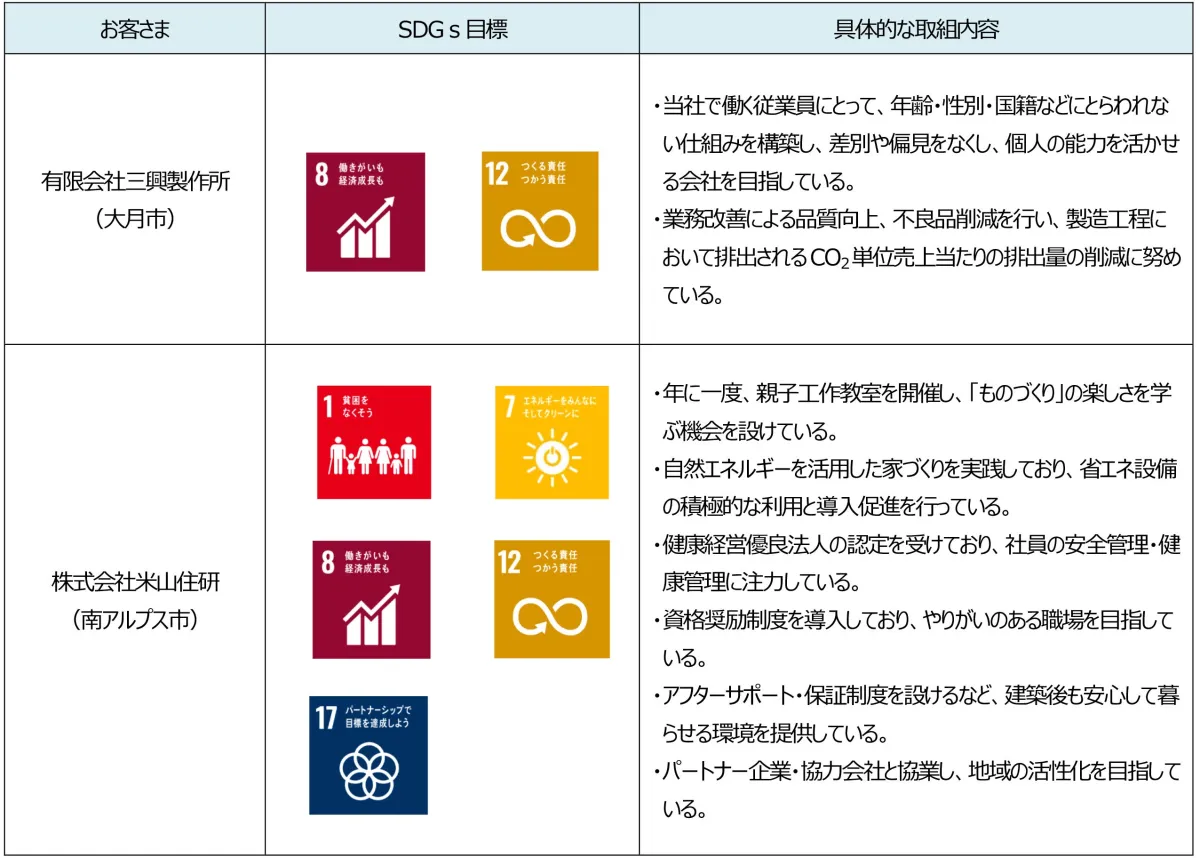 すでにこのローンを活用しているお客さまの情報は五十音順で公開されており、その中に地域貢献に注力している企業の姿が見受けられます。これらの企業は、SDGsの目標達成に向けた具体的な取り組みを行い、その影響が地域経済にも波及しています。