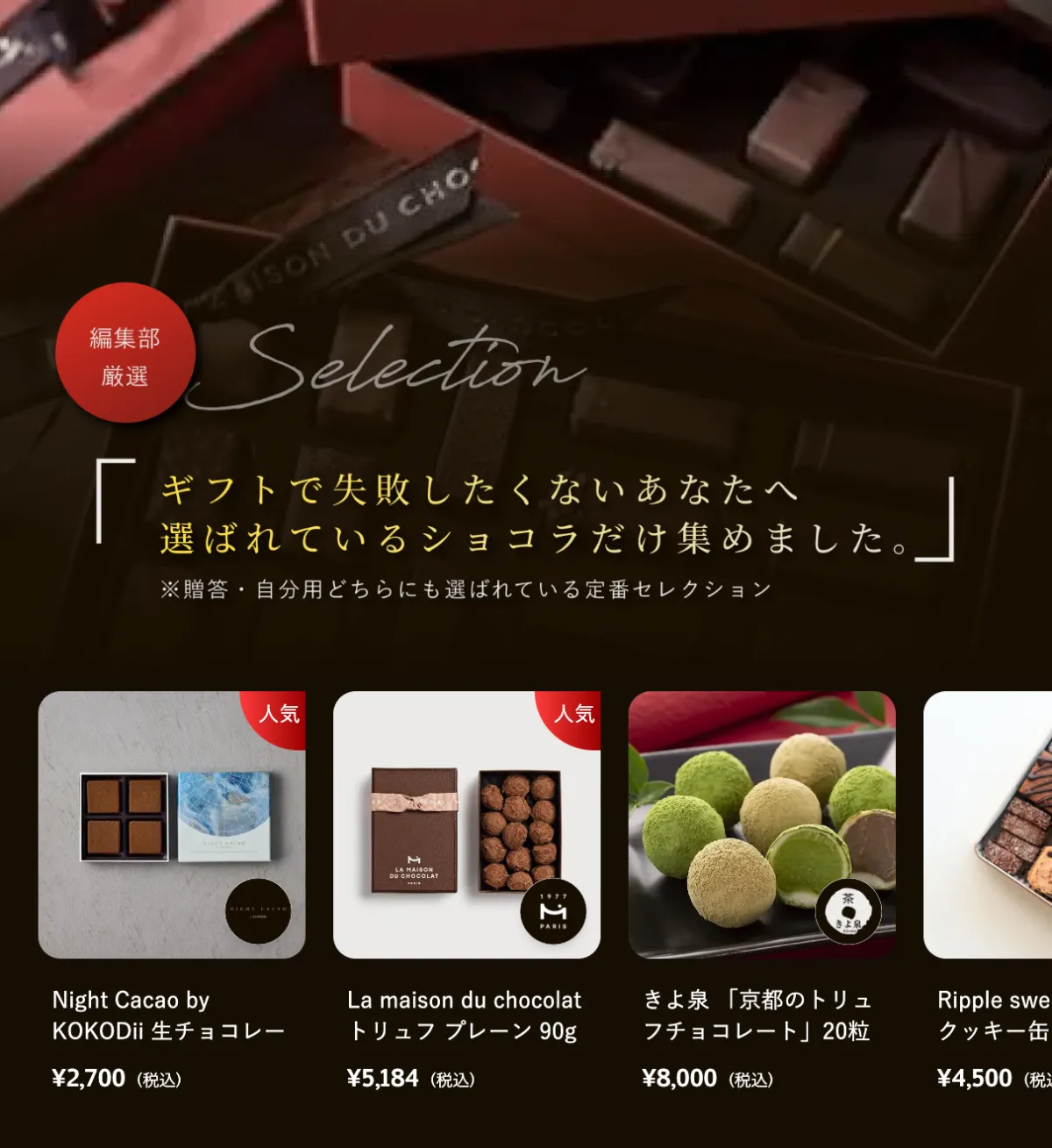 Choclieは、チョコレートブランドの魅力をユーザーに伝える高級チョコレート専門ECです。ギフト用途に限らず、自分へのご褒美としての利用も想定した購買体験を提供し、ユーザーが「選ぶ時間」を楽しむためのプラットフォームを目指しています。