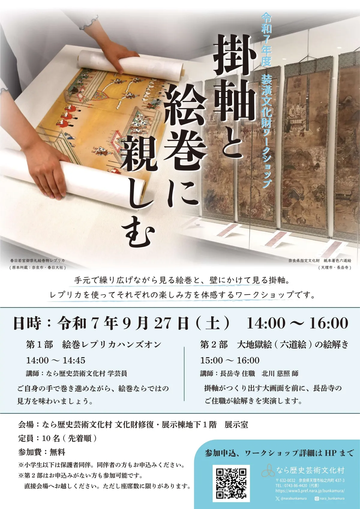 奈良歴史芸術文化村で、令和7年度の装潢文化財ワークショップ「掛軸と絵巻に親しむ」が開催されます。このイベントは、伝統的な日本の書画に触れ、美術館や博物館では味わえない身近な体験を提供します。