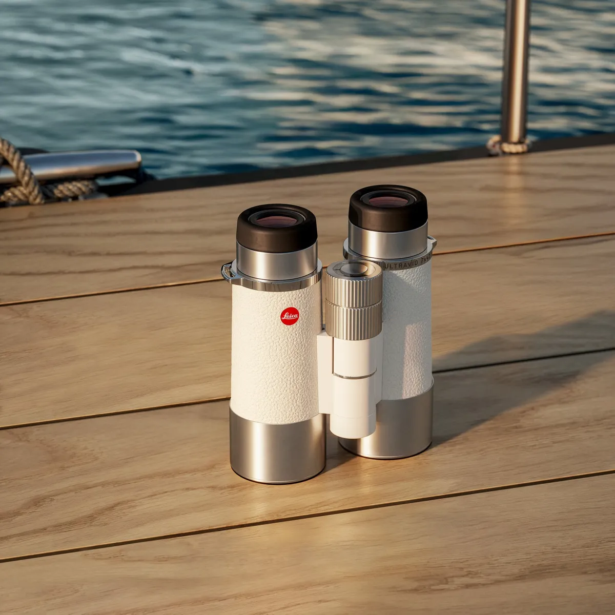 この双眼鏡の外観は、光沢が美しいステンレスと上品なホワイトレザーが融合しており、非常にスタイリッシュな雰囲気を醸し出します。まさにクルーザーのデッキや海に面したテラス、海岸沿いの街並に自然に溶け込むデザインに仕上がっています。特別なシーンでの使用を意識したこの双眼鏡は、その佇まいがまさに注目を集めることでしょう。