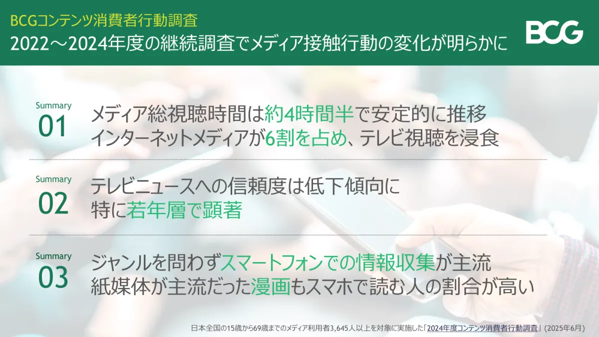 経営コンサルティングファームのボストン コンサルティング グループ(以下BCG)が発表した「2024年度コンテンツ消費者行動調査」により、日本のメディア環境における動向が浮き彫りになりました。調査は全国の15歳から69歳までの3,645人を対象に実施され、インターネットメディアとテレビニュースの関係性や信頼度が分析されています。